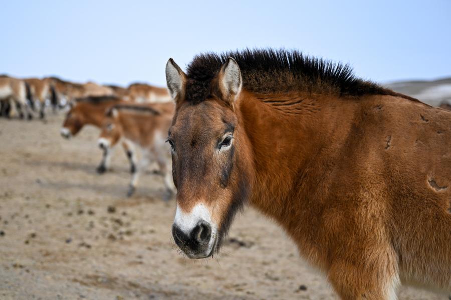 CHANGJI, Feb. 7 (Xinhua) -- The Przewalski's horse, a globally endangered species under first-class national protection in China, was once extinct in the wild within the country. In 1985, China launched a reintroduction program, bringing the horses back from abroad for breeding. After more than 40 years of scientific protection and breeding, the population of Przewalski's horses in China has surpassed 900, accounting for one-third of the global total.