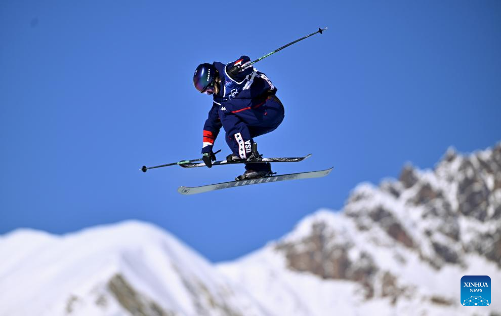 Avery Krumme of the United States competes during the freestyle skiing women's freeski slopestyle qualification of the Milan-Cortina 2026 Olympic Winter Games in Livigno, Italy, Feb. 7, 2026. (Xinhua/Zhang Hongxiang)