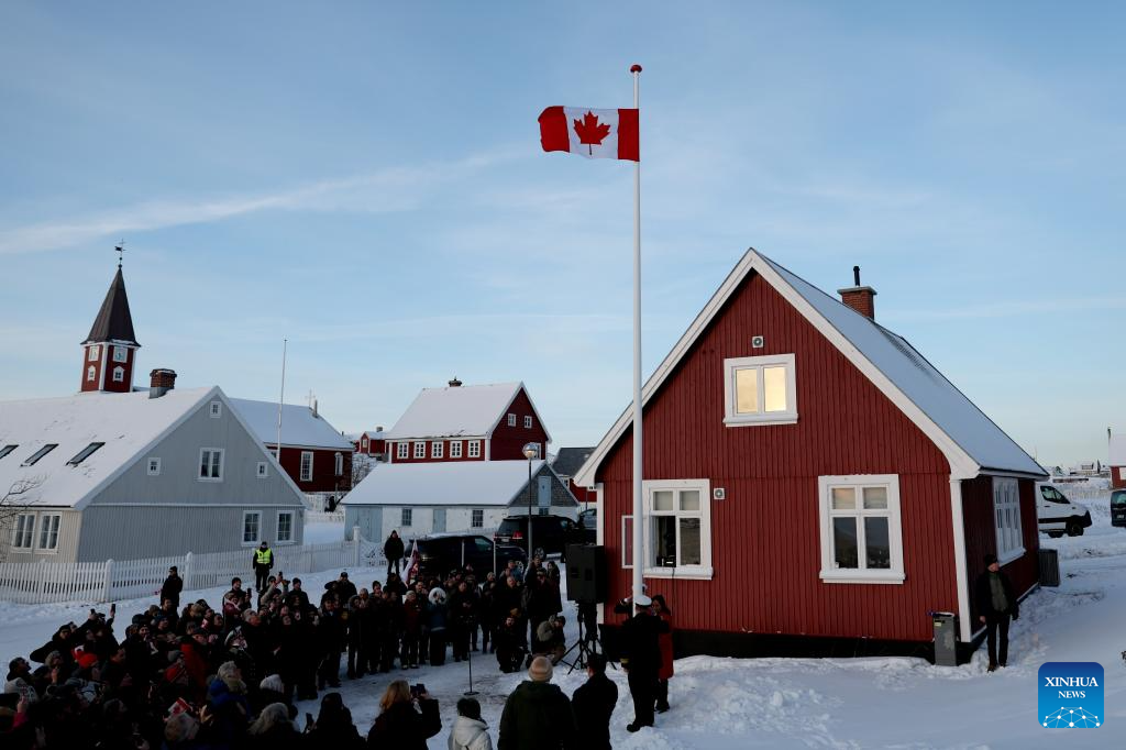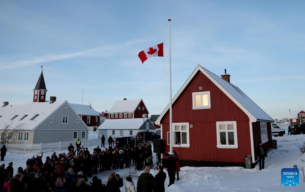 People raise Canadian flag during the opening ceremony of Canada's new consulate in Nuuk, the capital of Greenland, Denmark, Feb. 6, 2026. On Friday, France and Canada each opened a consulate in Nuuk. (Xinhua/Li Ying)