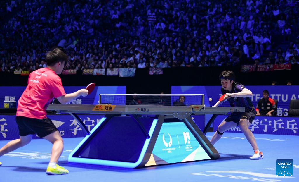 Wang Chuqin (R) of China and Izaac Quek of Singapore compete during the men's singles round of 16 match between Wang Chuqin of China and Izaac Quek of Singapore at the ITTF-ATTU Asian Cup Haikou 2026 table tennis tournament in Haikou, south China's Hainan Province, Feb. 7, 2026. (Xinhua/Yang Guanyu)