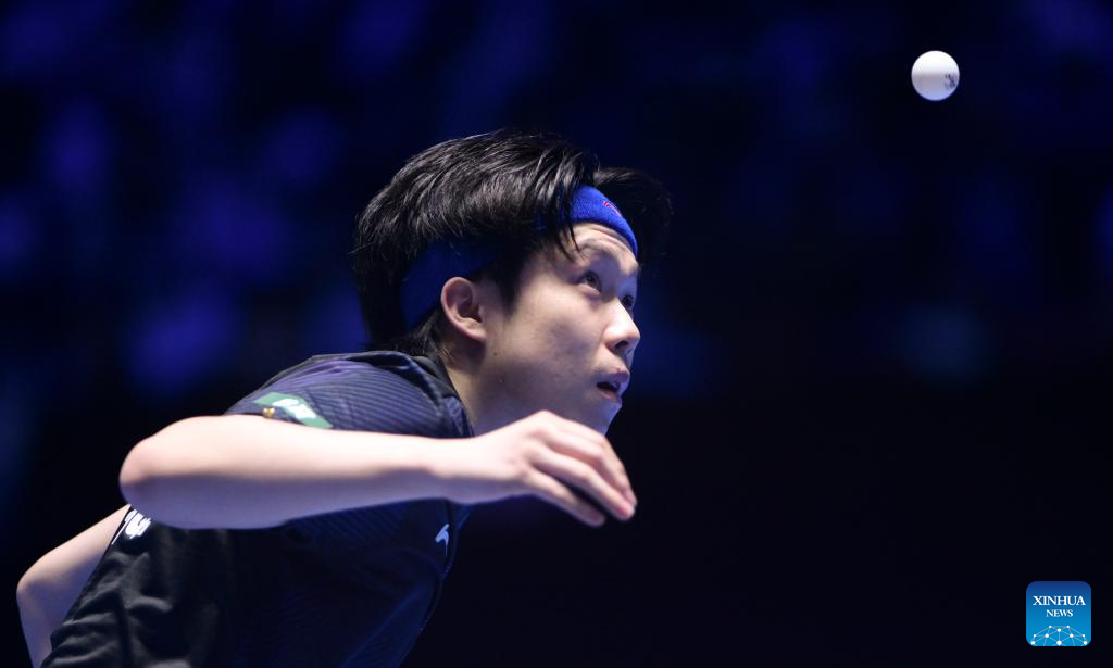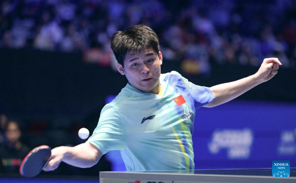Wang Chuqin hits a return during the men's singles round of 16 match between Wang Chuqin of China and Izaac Quek of Singapore at the ITTF-ATTU Asian Cup Haikou 2026 table tennis tournament in Haikou, south China's Hainan Province, Feb. 7, 2026. (Xinhua/Yang Guanyu)