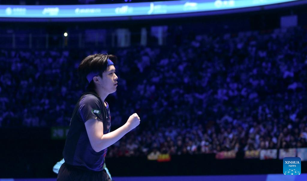 Wang Chuqin celebrates scoring during the men's singles round of 16 match between Wang Chuqin of China and Izaac Quek of Singapore at the ITTF-ATTU Asian Cup Haikou 2026 table tennis tournament in Haikou, south China's Hainan Province, Feb. 7, 2026. (Xinhua/Yang Guanyu)