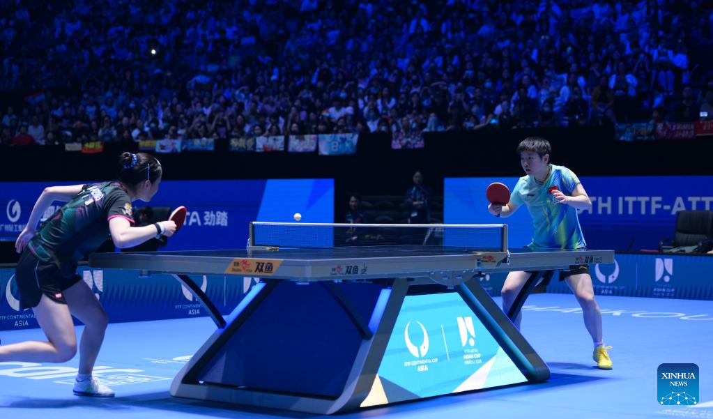 Sun Yingsha (R) competes with Kim Nayeong during the women's singles round of 16 match between Sun Yingsha of China and Kim Nayeong of South Korea at the ITTF-ATTU Asian Cup Haikou 2026 table tennis tournament in Haikou, south China's Hainan Province, Feb. 7, 2026. (Xinhua/Yang Guanyu)