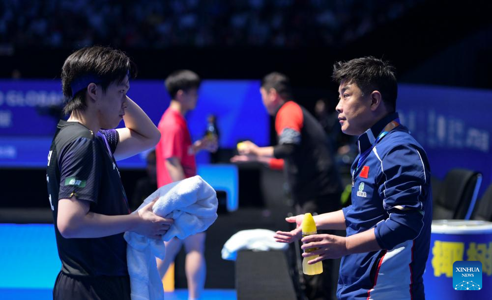 Wang Chuqin (L) listens to coach Wang Hao during the men's singles round of 16 match between Wang Chuqin of China and Izaac Quek of Singapore at the ITTF-ATTU Asian Cup Haikou 2026 table tennis tournament in Haikou, south China's Hainan Province, Feb. 7, 2026. (Xinhua/Yang Guanyu)