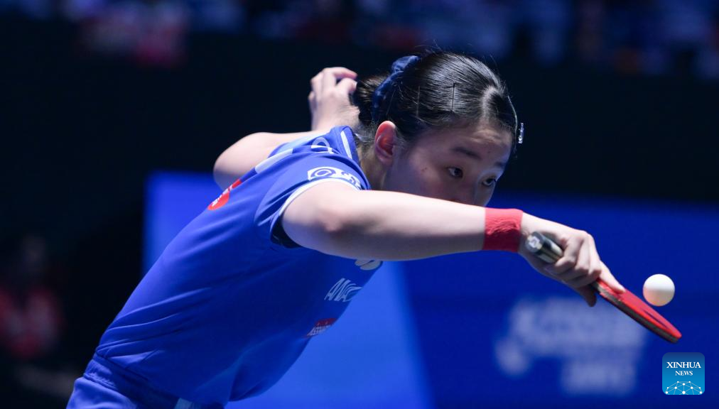 Kim Nayeong hits a return during the women's singles round of 16 match between Sun Yingsha of China and Kim Nayeong of South Korea at the ITTF-ATTU Asian Cup Haikou 2026 table tennis tournament in Haikou, south China's Hainan Province, Feb. 7, 2026. (Xinhua/Yang Guanyu)