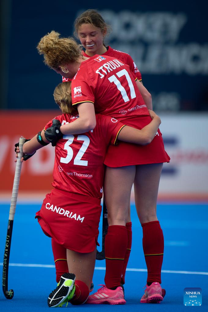 Players of Belgium celebrate a goal during the FIH Hockey Pro League women's match between Germany and Belgium in Valencia, Spain, Feb. 6, 2026. (Photo by Pablo Morano/Xinhua)