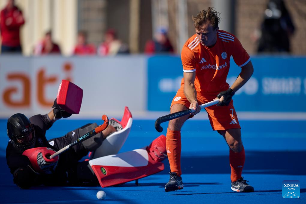 Stuart Rushmere (L) of England vies with Derck de Vilder of the Netherlands during the FIH Hockey Pro League men's match between England and the Netherlands in Valencia, Spain, Feb. 6, 2026. (Photo by Pablo Morano/Xinhua)