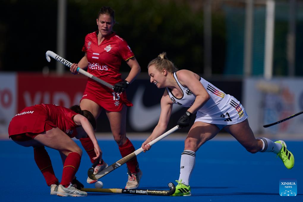 Sara Strauss (R) of Germany vies with Alix Garniers (C) of Belgium during the FIH Hockey Pro League women's match between Germany and Belgium in Valencia, Spain, Feb. 6, 2026. (Photo by Pablo Morano/Xinhua)