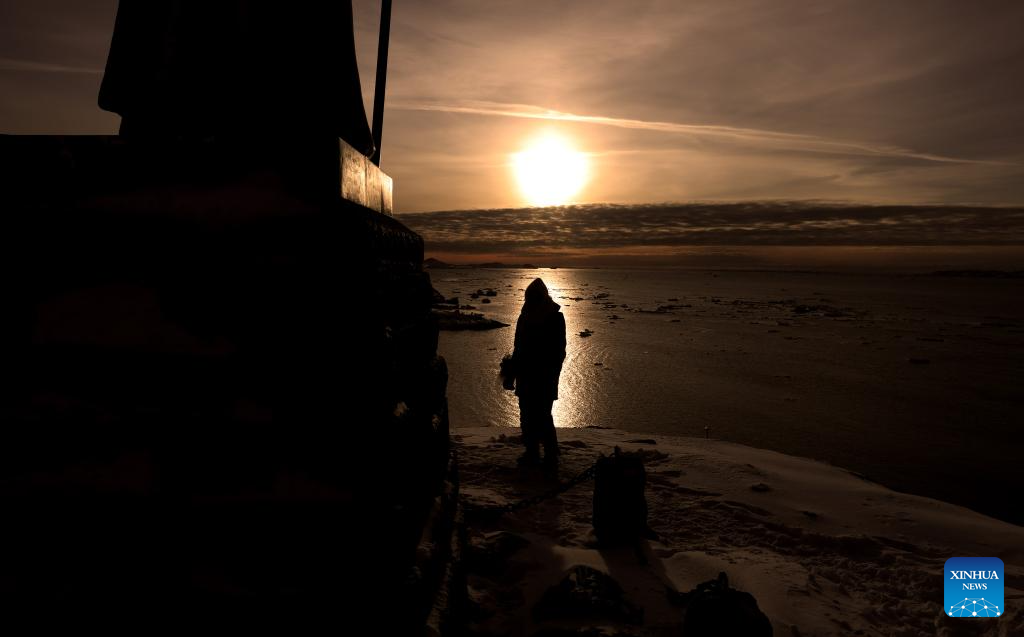 A woman stands in the light at sunset in Nuuk, Greenland, an autonomous territory of Denmark, Feb. 6, 2026. (Xinhua/Li Ying)