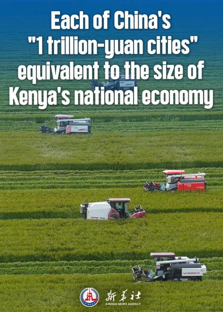 China now has 29 cities with GDP topping 1 trillion yuan (about 144 billion dollars), with each roughly comparable to the size of Kenya's national economy, underscoring the strong momentum and solid foundations of China's urban and regional economies.