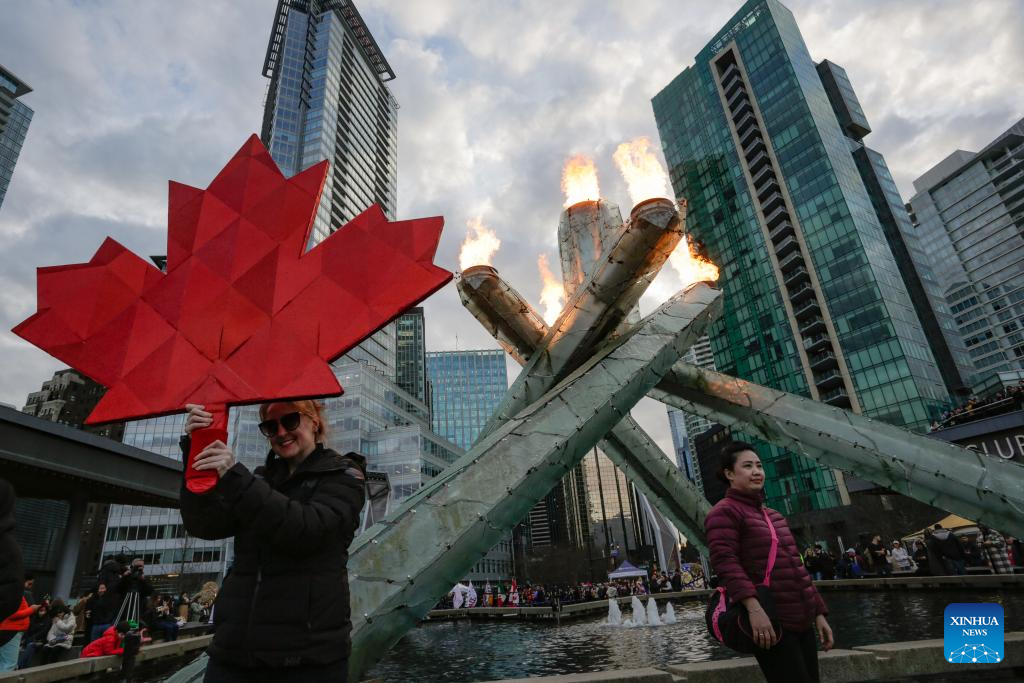 People gather by the Olympic Cauldron at Jack Poole Plaza in Vancouver, British Columbia, Canada, Feb. 6, 2026. The Olympic Cauldron in Vancouver was relit on Friday to mark the opening day of the 2026 Milan-Cortina Winter Olympics in Italy. (Photo by Liang Sen/Xinhua)