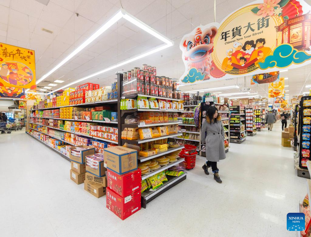 People shop at a supermarket with decorations marking the upcoming Chinese New Year of the Horse in Toronto, Ontario, Canada, on Feb. 6, 2026.
