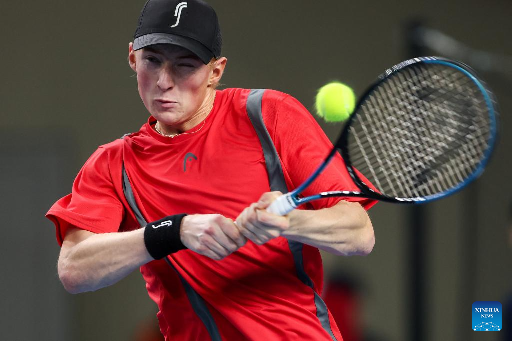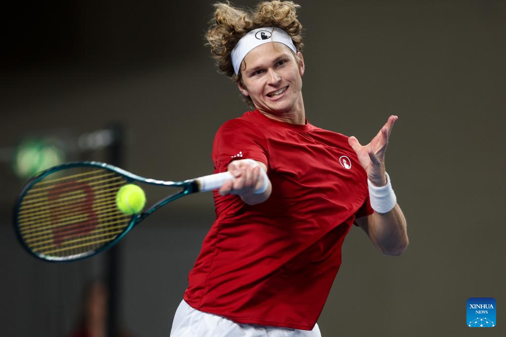 August Holmgren of Team Denmark hits a return in the second match against Dino Prizmic of Team Croatia during the Davis Cup Qualifier first round match between Croatia and Denmark in Varazdin, Croatia, on Feb. 6, 2026. (Photo by Igor Kralj/PIXSELL via Xinhua)