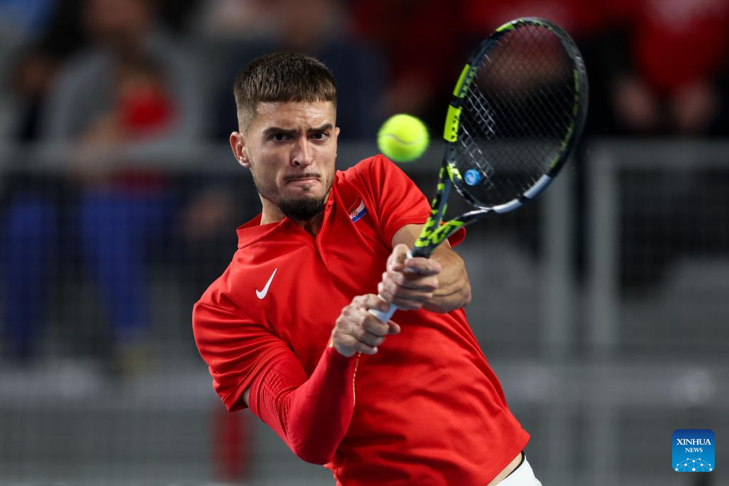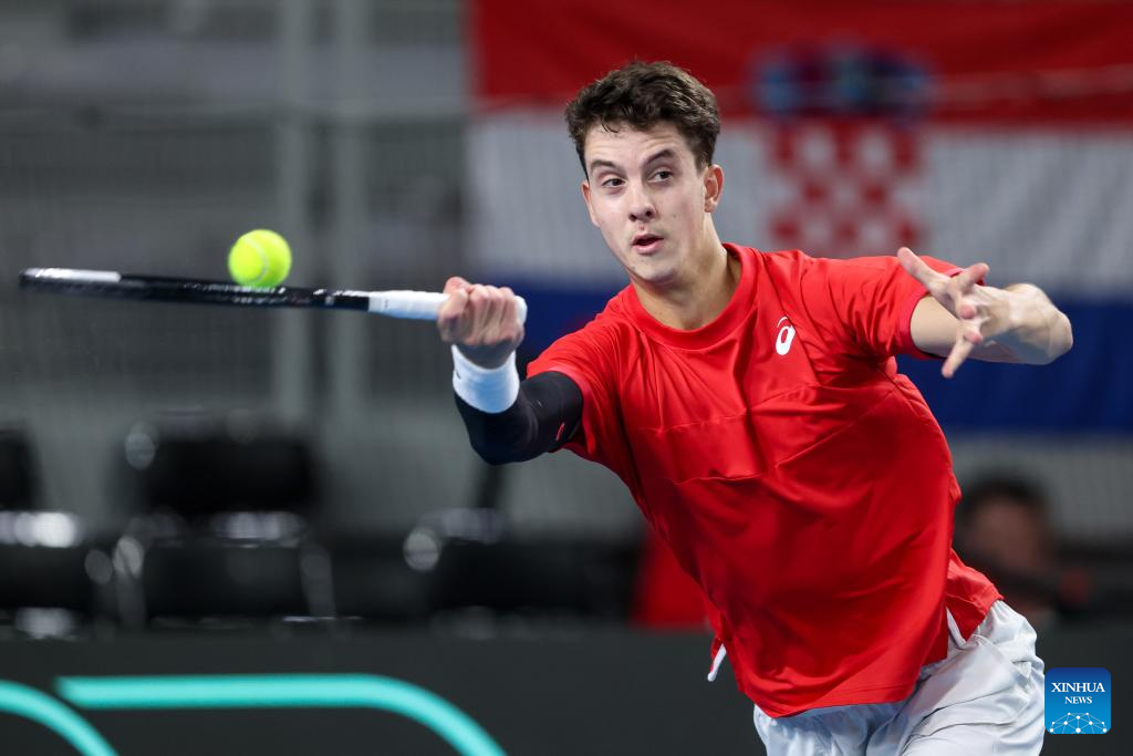 Dino Prizmic of Team Croatia hits a return in the second match against August Holmgren of Team Denmark during the Davis Cup Qualifier first round match between Croatia and Denmark in Varazdin, Croatia, on Feb. 6, 2026. (Photo by Igor Kralj/PIXSELL via Xinhua)