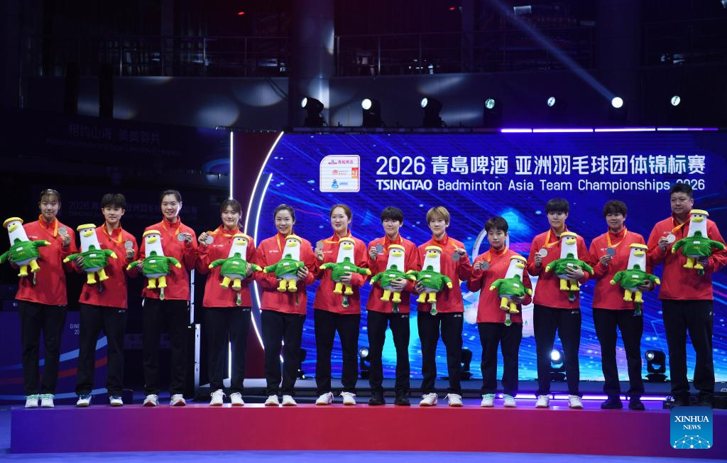 Silver medalists team China pose during the awarding ceremony after women's team final match between China and South Korea at Badminton Asia Team Championships 2026 in Qingdao, east China's Shandong Province, Feb. 8, 2026. (Xinhua/Li Ziheng)