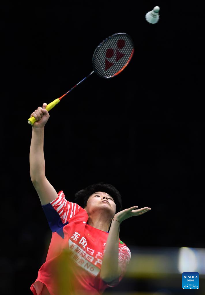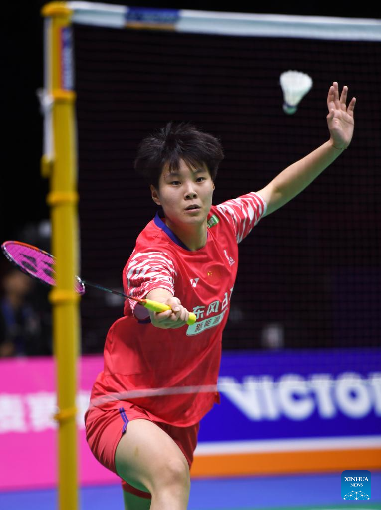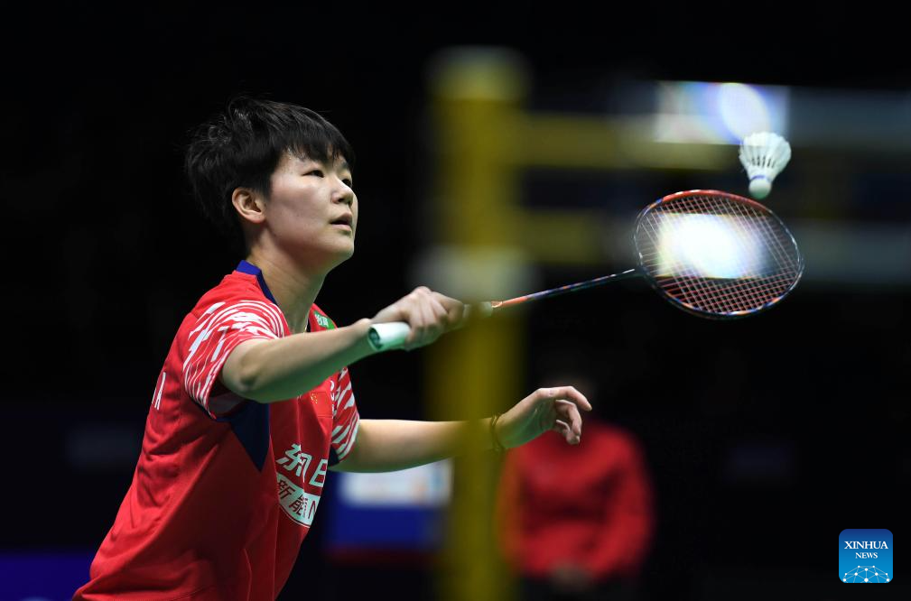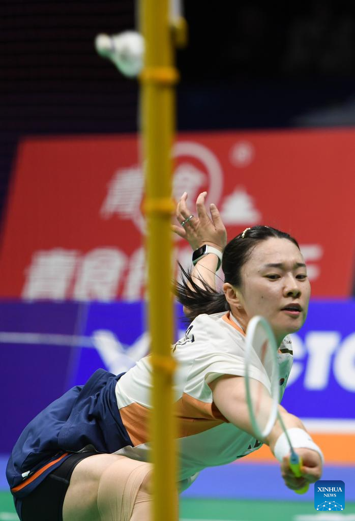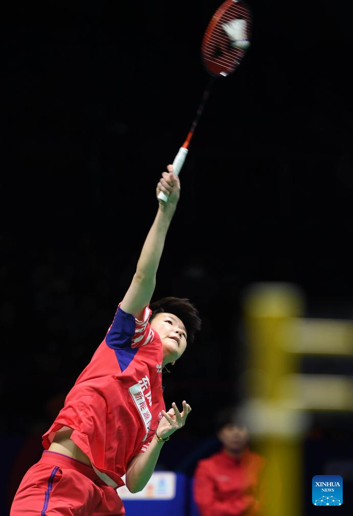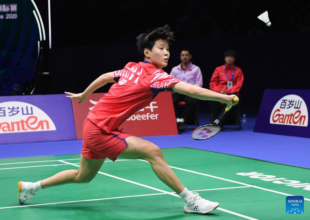 Xu Wenjing of China hits a return in the women's singles match against Kim Ga Eun of South Korea during the women's team final match between China and South Korea at Badminton Asia Team Championships 2026 in Qingdao, east China's Shandong Province, Feb. 8, 2026. (Xinhua/Li Ziheng)