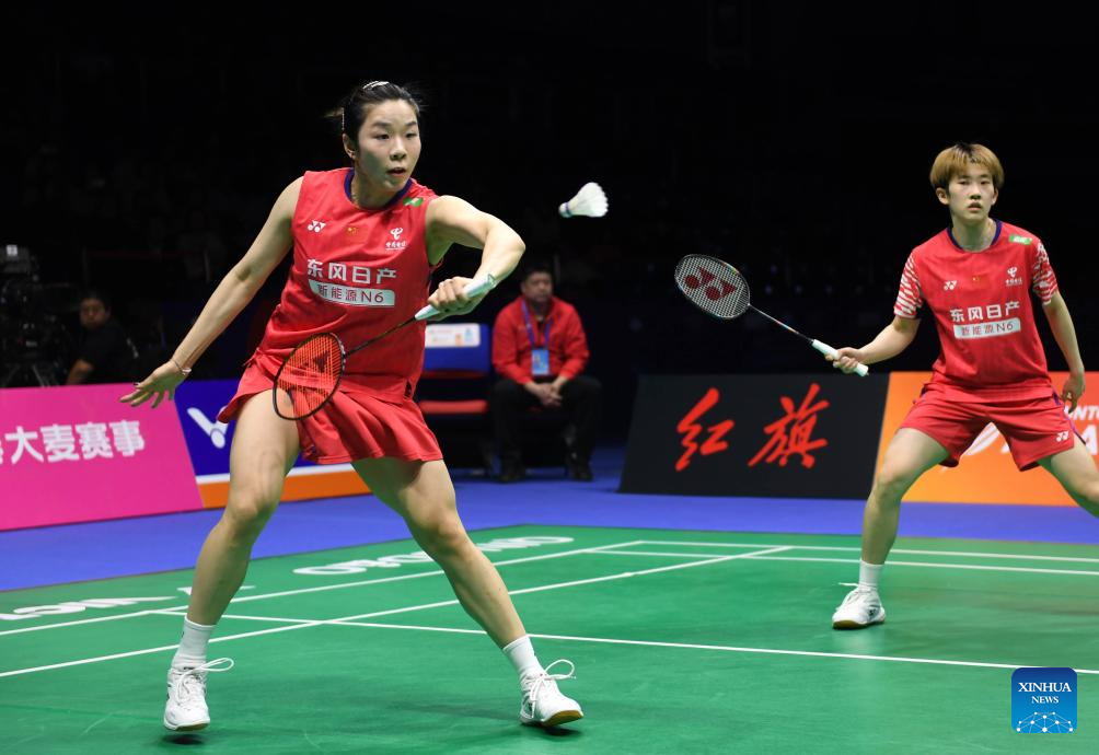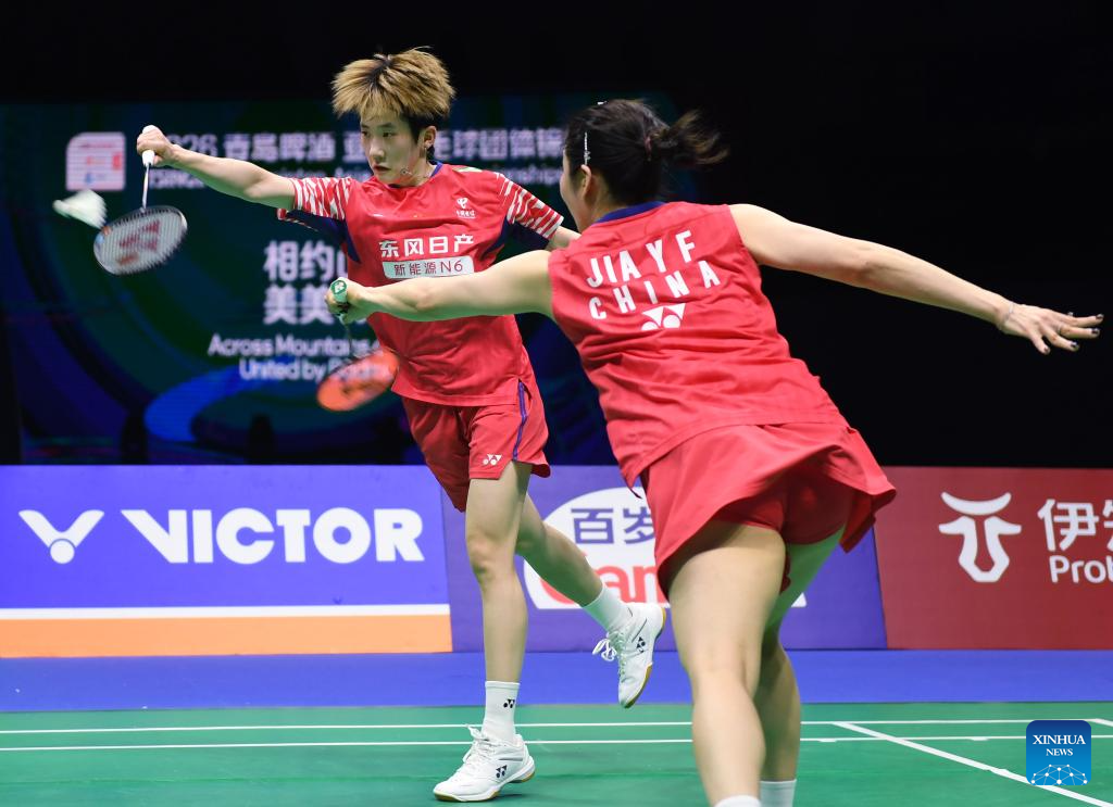 Jia Yifan (L)/Zhang Shuxian of China compete in the women's doubles match against Baek Ha Na/Kim Hye Jeong of South Korea during the women's team final match between China and South Korea at Badminton Asia Team Championships 2026 in Qingdao, east China's Shandong Province, Feb. 8, 2026. (Xinhua/Li Ziheng)
