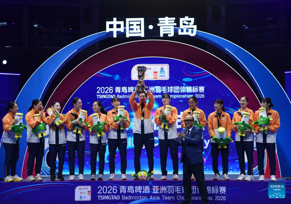 Gold medalists team South Korea pose during the awarding ceremony after women's team final match between China and South Korea of Badminton Asia Team Championships 2026 in Qingdao, east China's Shandong Province, Feb. 8, 2026. (Xinhua/Li Ziheng)
