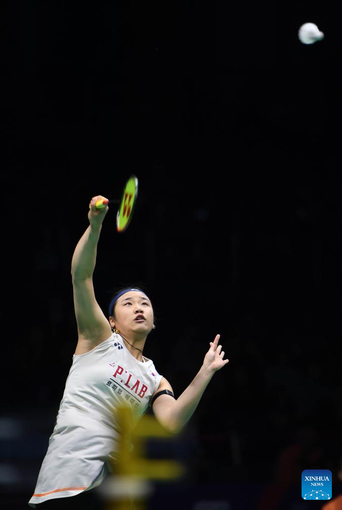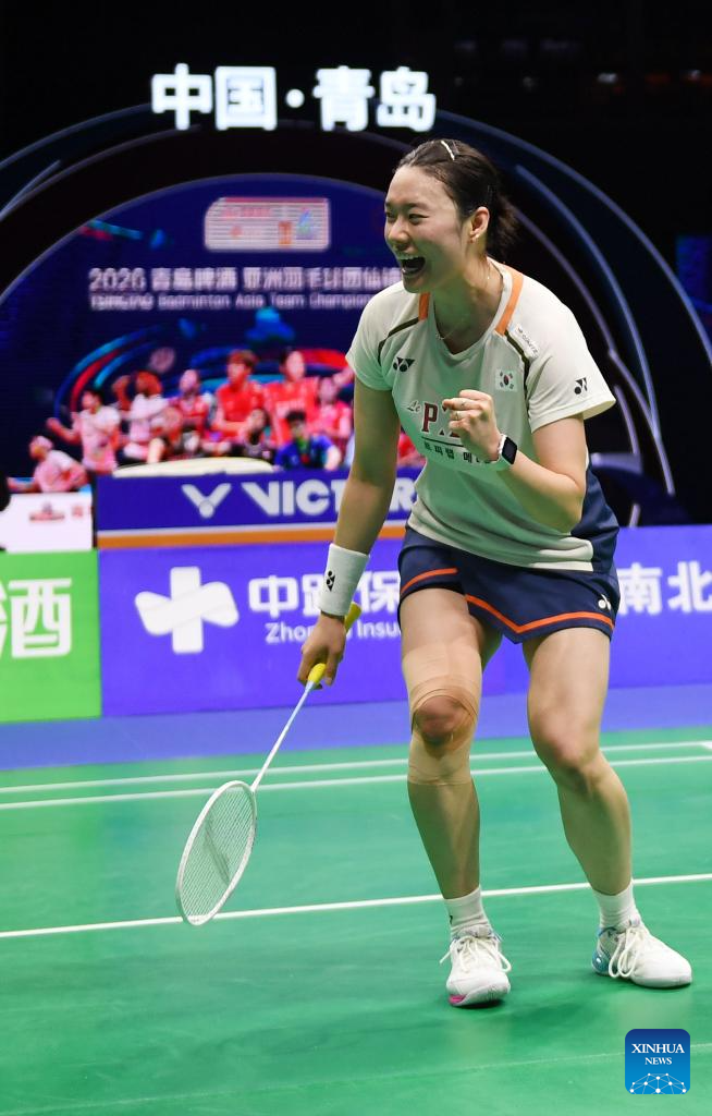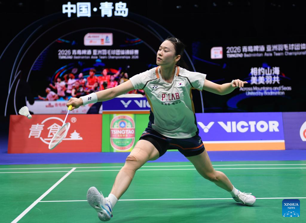 An Se Young of South Korea hits a return in the women's singles match against Han Qianxi of China during the women's team final match between China and South Korea at Badminton Asia Team Championships 2026 in Qingdao, east China's Shandong Province, Feb. 8, 2026. (Xinhua/Li Ziheng)