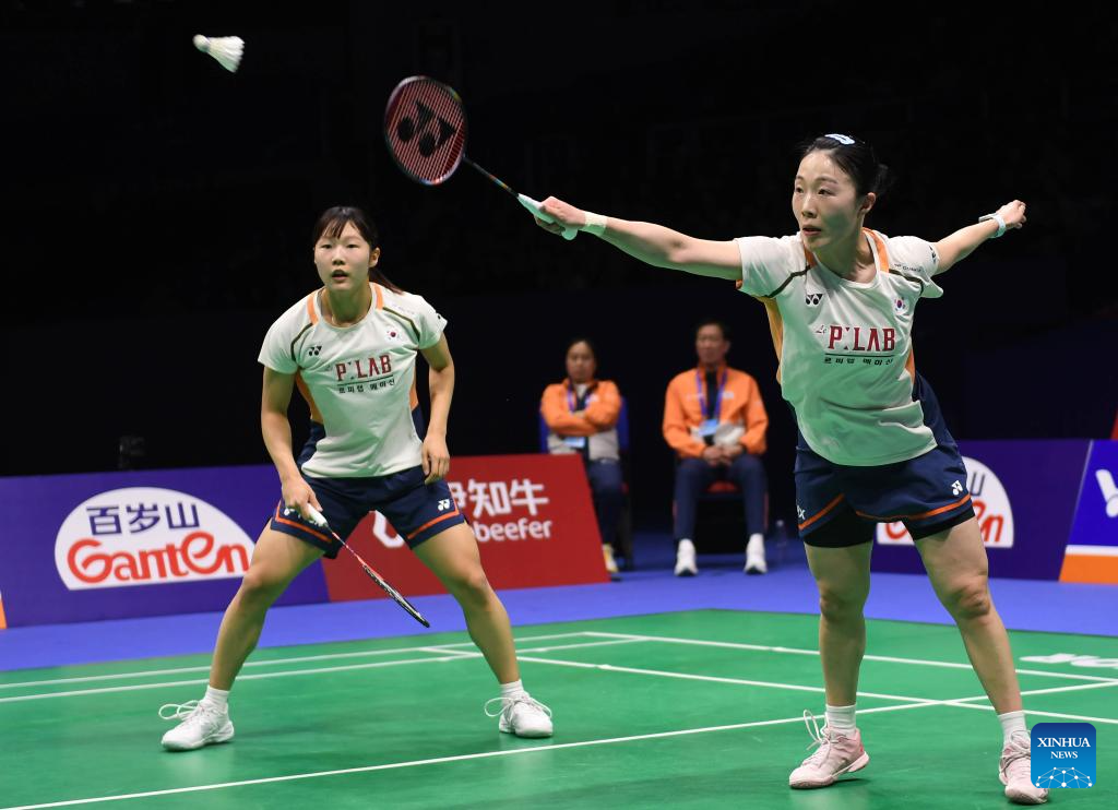 Baek Ha Na/Kim Hye Jeong (R) of South Korea compete in the women's doubles match against Jia Yifan/Zhang Shuxian of China during the women's team final match between China and South Korea at Badminton Asia Team Championships 2026 in Qingdao, east China's Shandong Province, Feb. 8, 2026. (Xinhua/Li Ziheng)