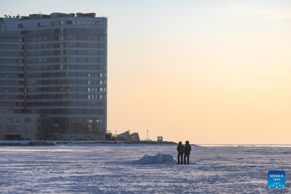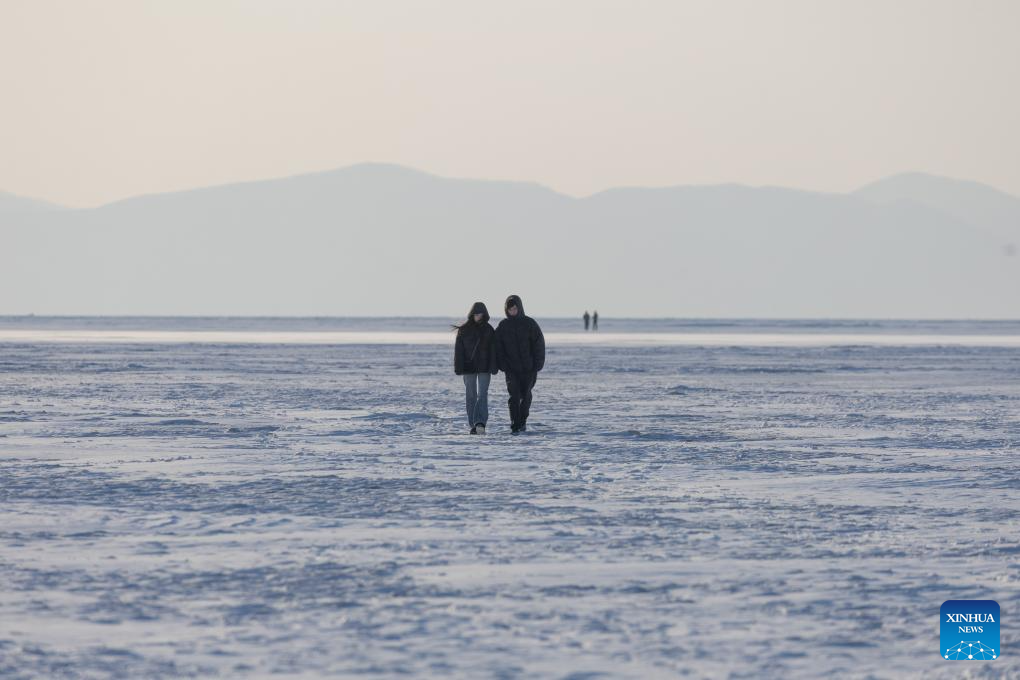 People stroll on frozen sea in Vladivostok, Russia, on Feb. 7, 2026. (Photo by Andrey Matveenko/Xinhua)