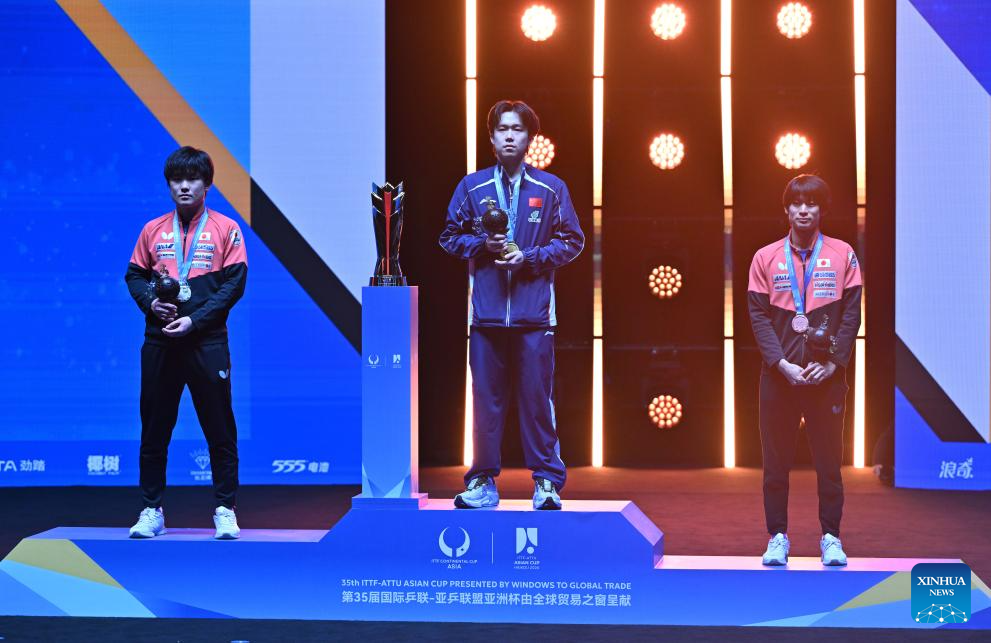 Wang Chuqin holds the trophy on the podium after the men's singles final between Wang Chuqin of China and Harimoto Tomokazu of Japan at the ITTF-ATTU Asian Cup Haikou 2026 table tennis tournament in Haikou, south China's Hainan Province, Feb. 8, 2026. (Xinhua/Guo Cheng)