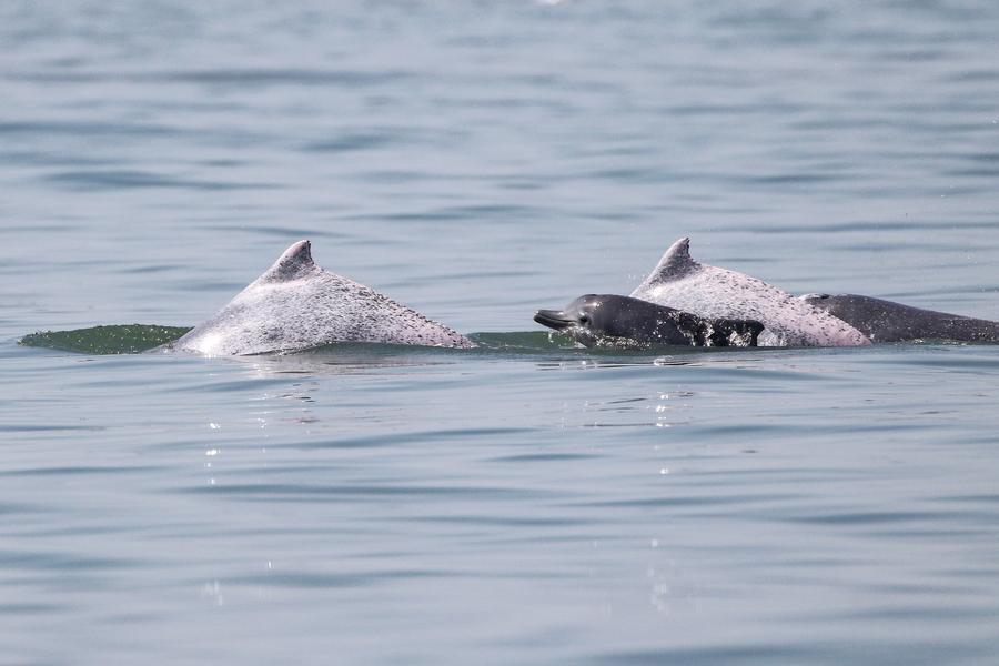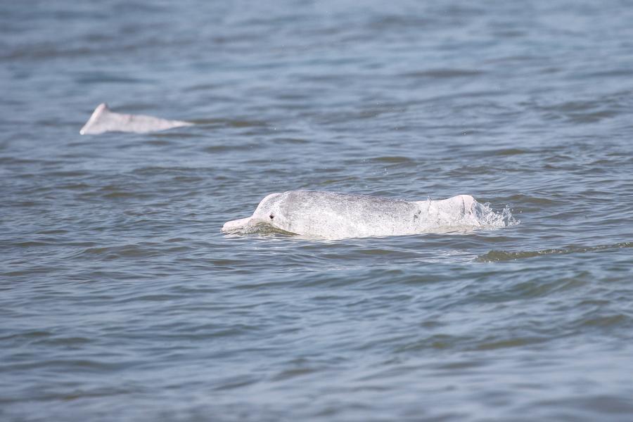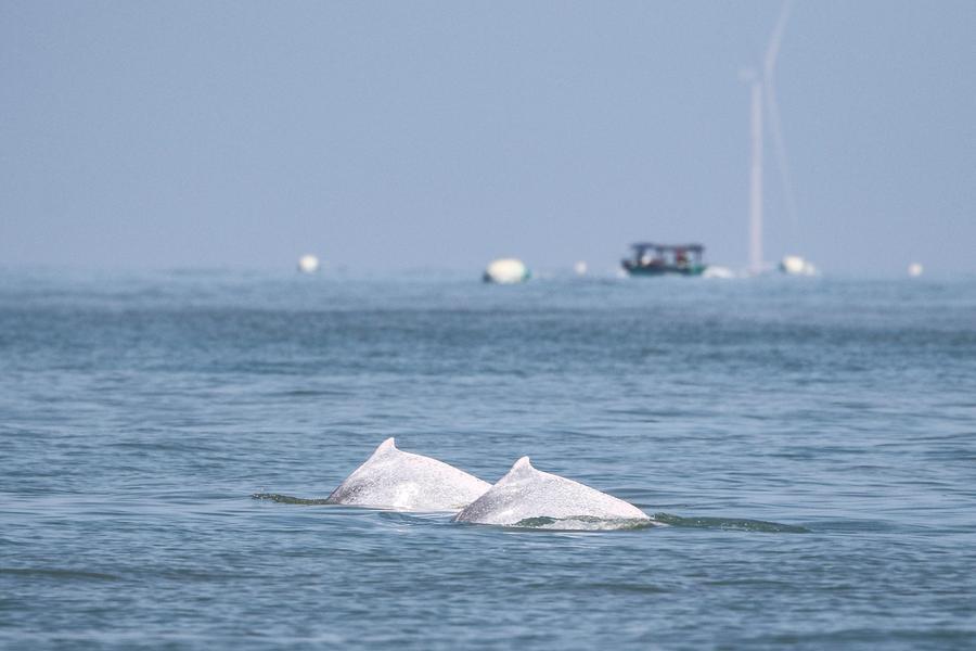 HAIKOU, Feb. 8 (Xinhua) -- During a special investigation in waters southwest of the island province of Hainan, a research team with the Institute of Deep-sea Science and Engineering under the Chinese Academy of Sciences spotted a group of Chinese white dolphins, with an estimated number of about 30 to 50. This sighting recorded a relatively large number of this species in the area in recent years. Chinese white dolphins typically move in small group of fewer than 10, making this sighting a rare occurrence. Highly sensitive to marine water quality, the Chinese white dolphin, an endangered species under first-class national protection in China, is also viewed as a health indicator of the ecosystem they live in.