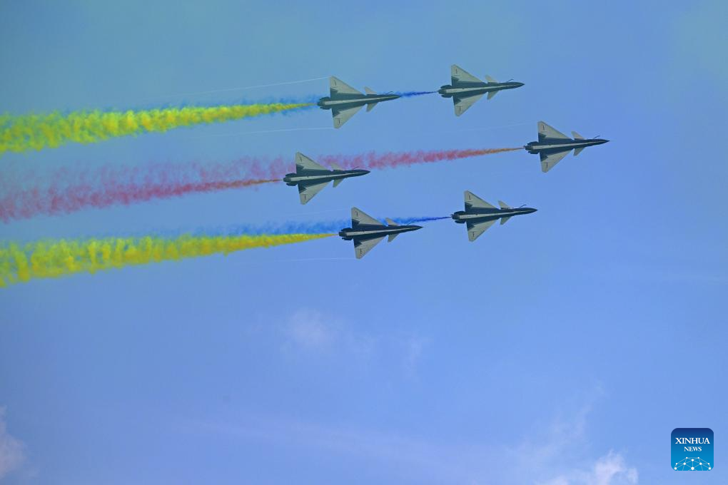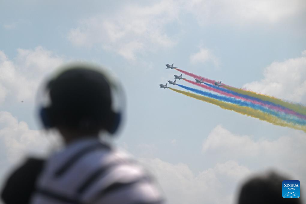 Aircraft of the Bayi Aerobatic Team of the Chinese People's Liberation Army (PLA) Air Force perform during the 10th Singapore Airshow in Singapore, Feb. 7, 2026. (Photo by Then Chih Wey/Xinhua)