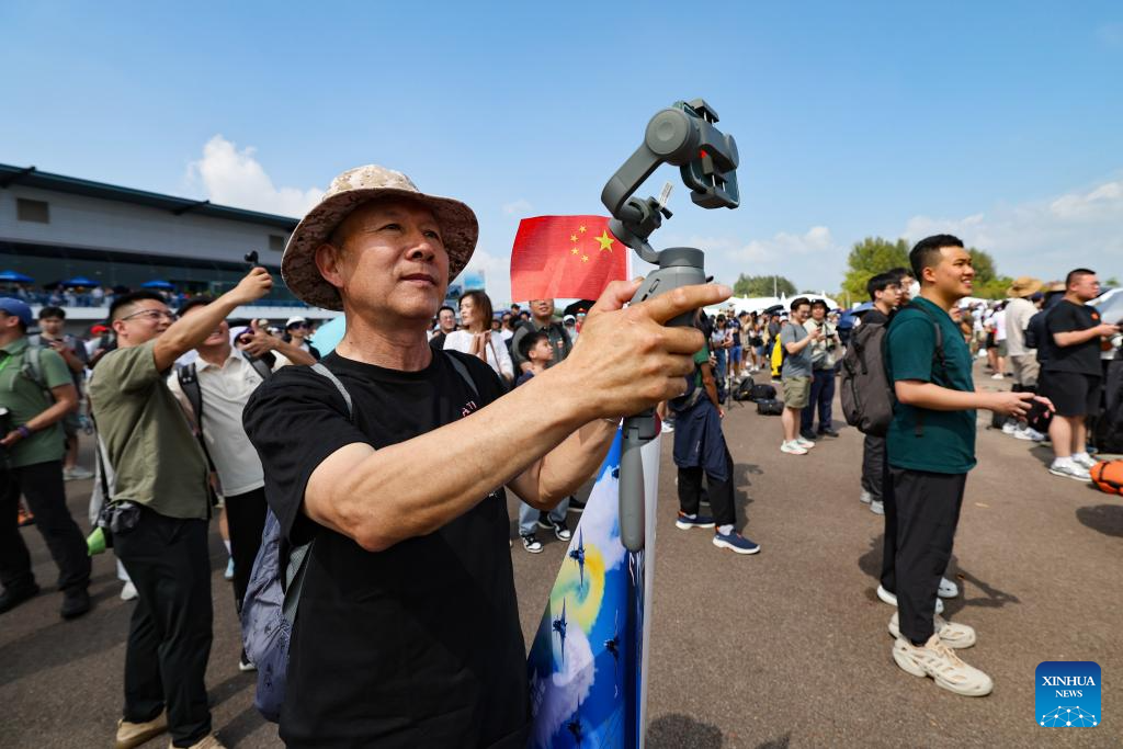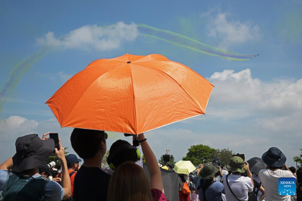 People watch an aircraft performance by the Bayi Aerobatic Team of the Chinese People's Liberation Army (PLA) Air Force during the 10th Singapore Airshow in Singapore, Feb. 7, 2026. (Photo by Then Chih Wey/Xinhua)