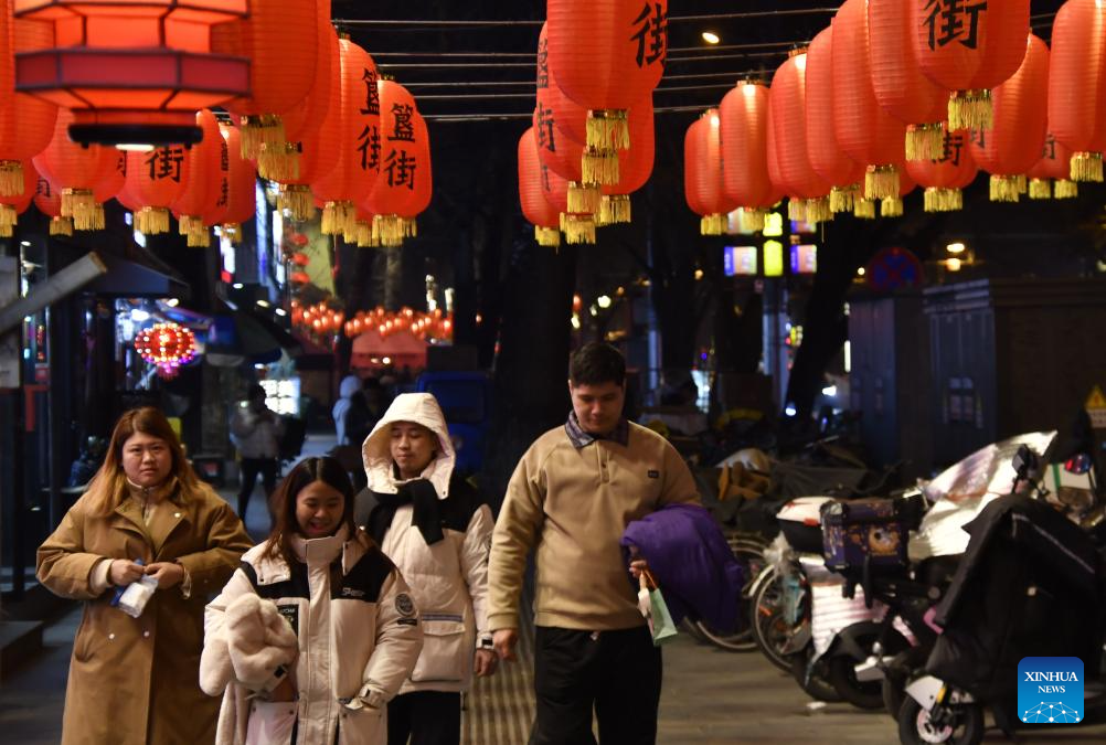 People walk under lanterns hung to celebrate Spring Festival in Beijing, capital of China, Feb. 7, 2026. (Xinhua/Li Xin)
