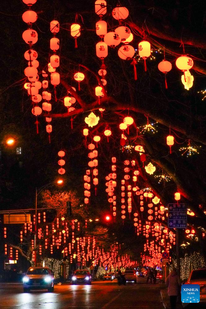 This photo taken on Feb. 7, 2026 shows lanterns hung to celebrate Spring Festival in Beijing, capital of China. (Photo by Liu Mancang/Xinhua)