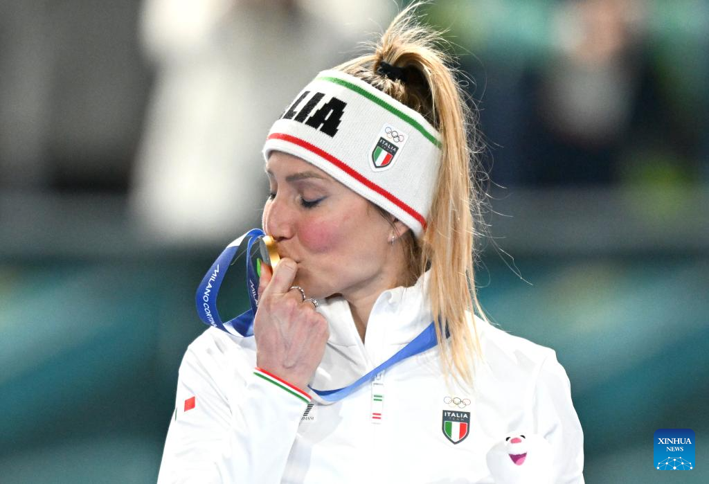 Francesca Lollobrigida of Italy kisses her medal during the awarding ceremony of the speed skating women's 3000m at the Milan-Cortina 2026 Olympic Winter Games in Milan, Italy, Feb. 7, 2026. (Xinhua/Wu Wei)