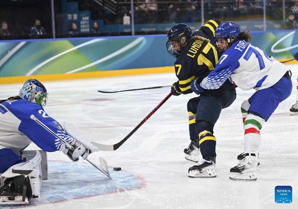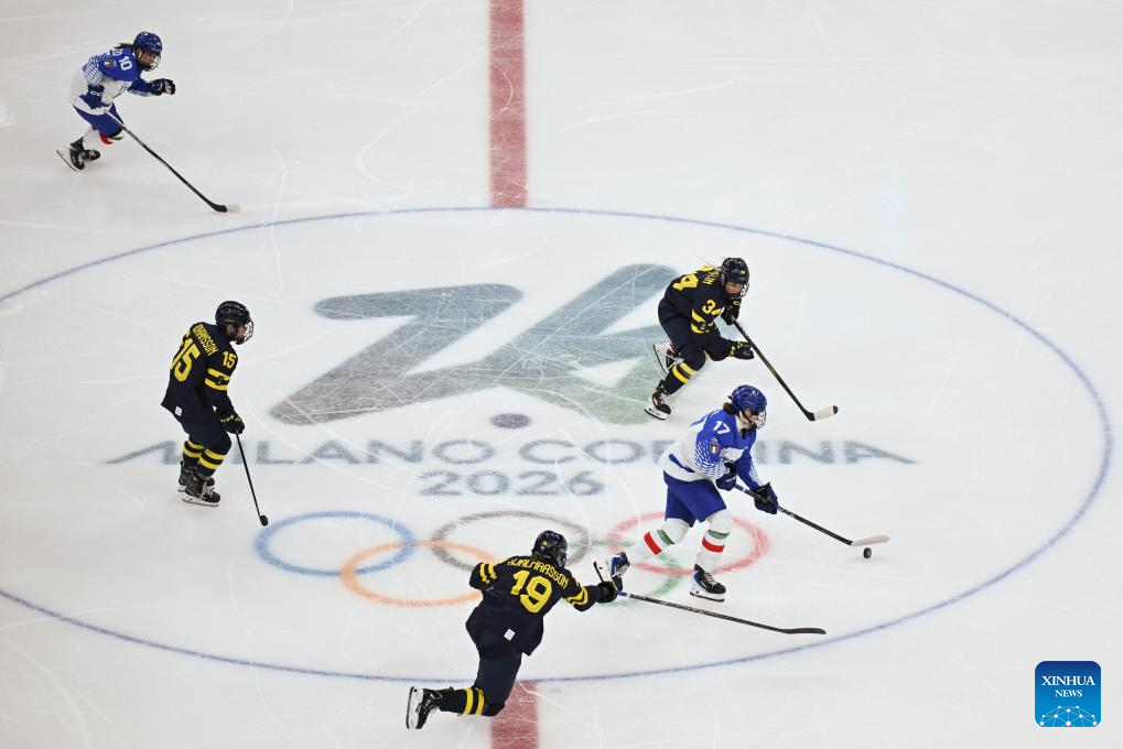 Players compete during the ice hockey women's preliminary round group B match between Sweden and Italy at the Milan-Cortina 2026 Olympic Winter Games in Milan, Italy, Feb. 7, 2026. (Xinhua/Zhang Haofu)