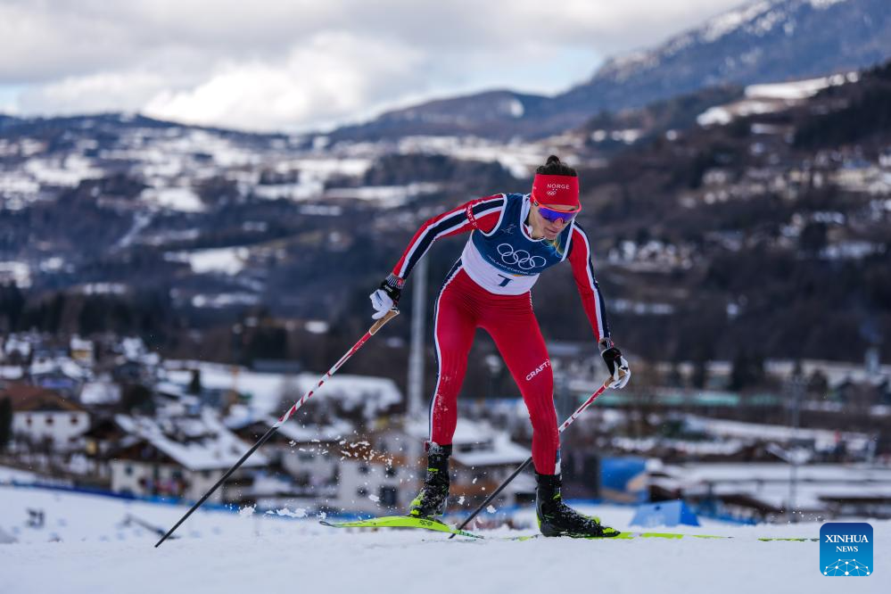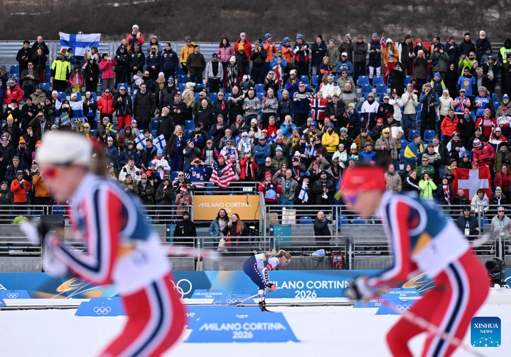 Heidi Weng of Norway competes during the Cross-Country Skiing Women's 10km+10km Skiathlon of the Milan-Cortina 2026 Olympic Winter Games in Tesero, Italy, Feb. 7, 2026. (Xinhua/Peng Ziyang)