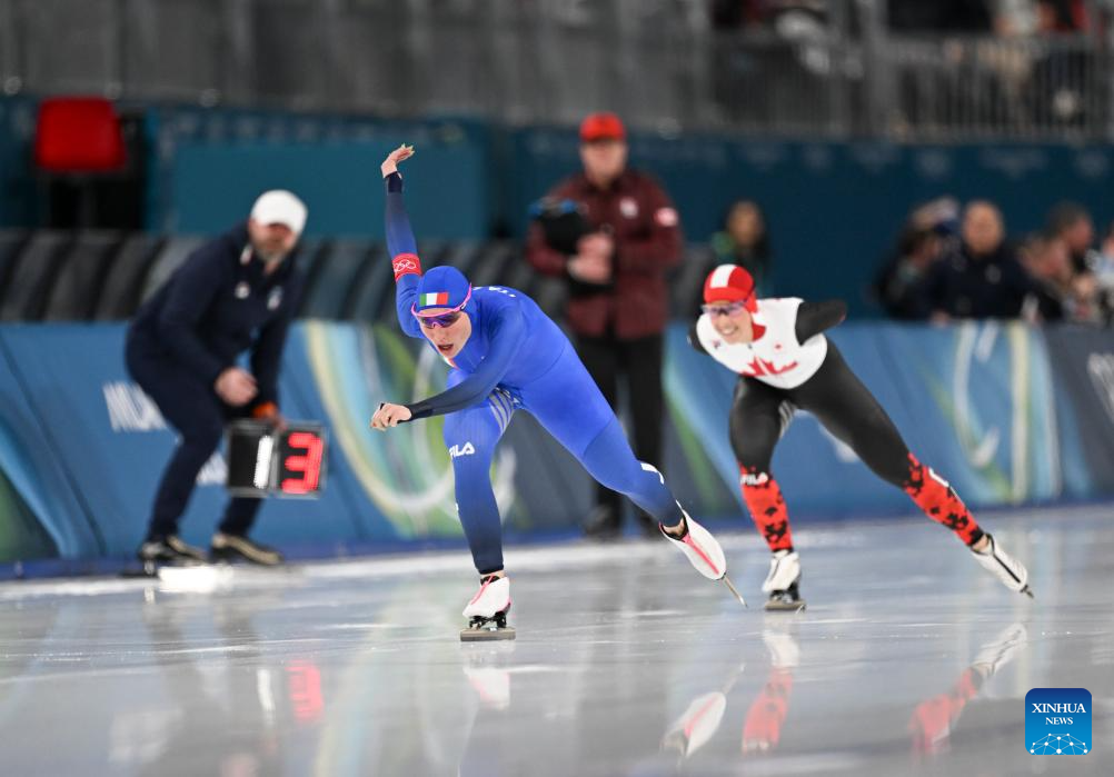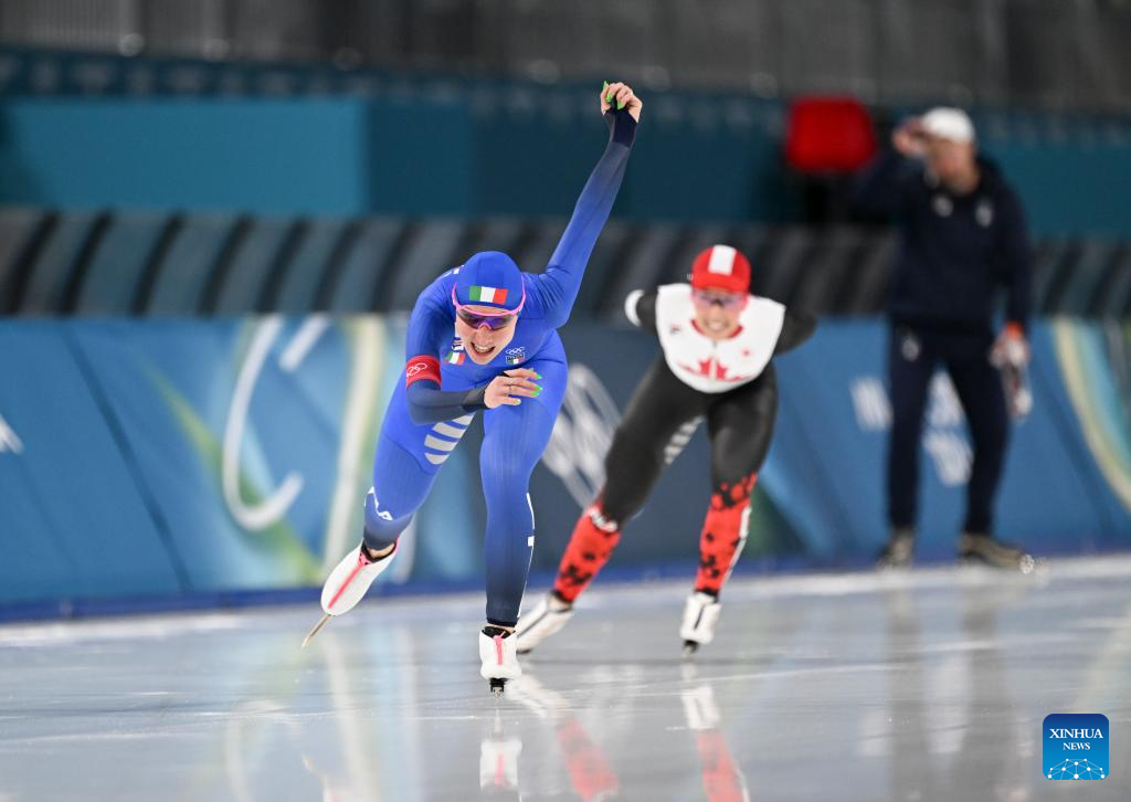 Francesca Lollobrigida (L) of Italy competes during the speed skating women's 3000m final at the Milan-Cortina 2026 Olympic Winter Games in Milan, Italy, Feb. 7, 2026. (Xinhua/Wu Wei)