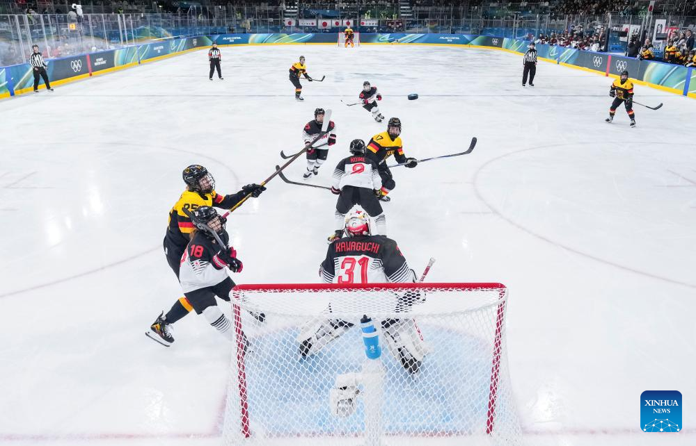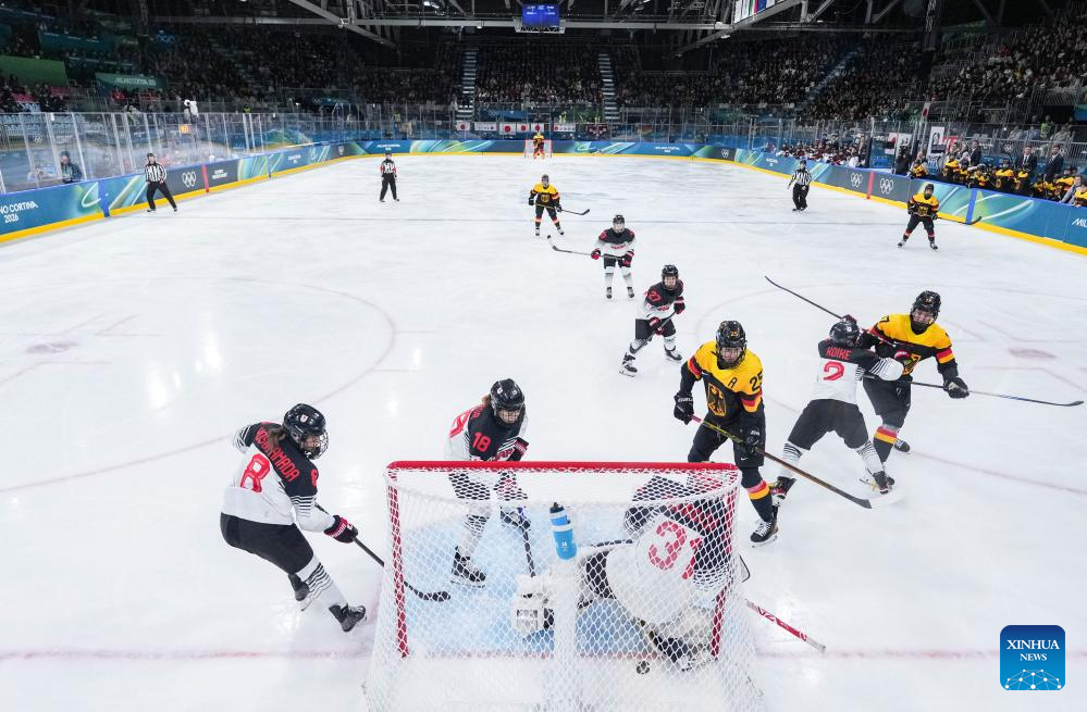 Laura Kluge (3rd R, front) of Germany shoots to score during the ice hockey women's preliminary round group B match between Germany and Japan of the Milan-Cortina 2026 Olympic Winter Games in Milan, Italy, Feb. 7, 2026. (Xinhua/Sun Fei)