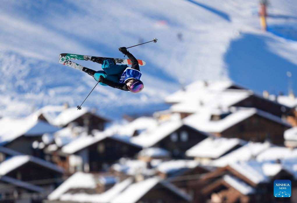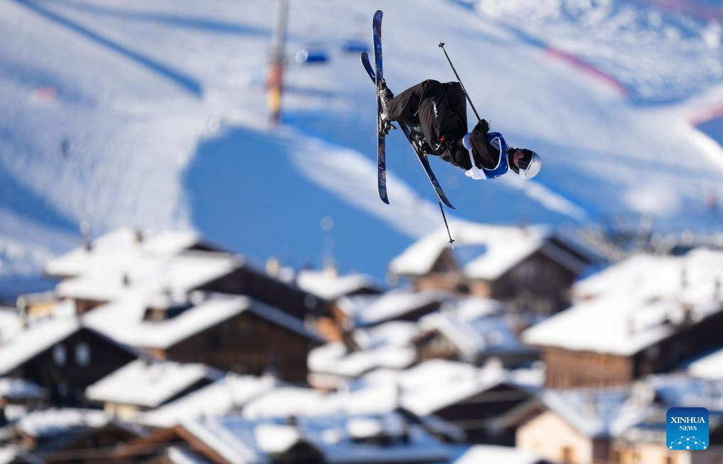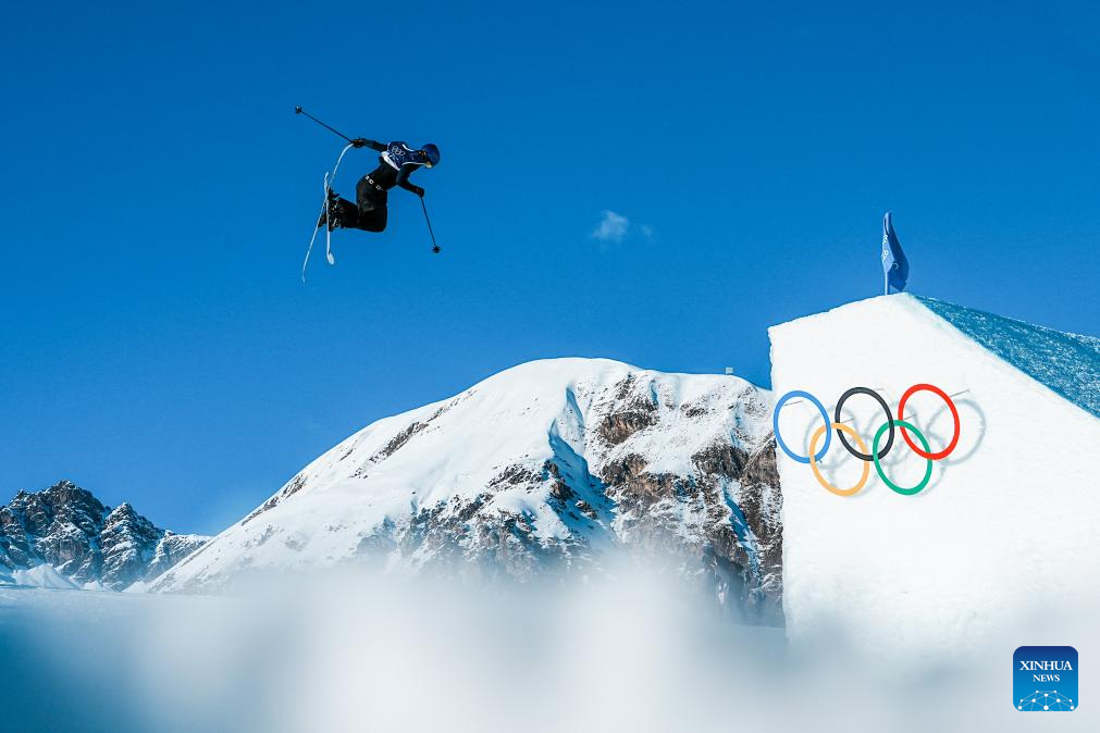 Nils Rhyner of Switzerland competes during the freestyle skiing men's freeski slopestyle qualification of the Milan-Cortina 2026 Olympic Winter Games in Livigno, Italy, Feb. 7, 2026. (Xinhua/Xia Yifang)