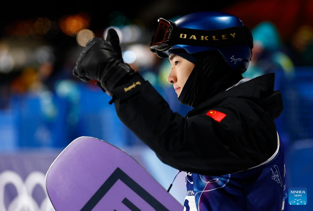 Su Yiming of China celebrates during the Men's Snowboard Big Air Final at the Milan-Cortina 2026 Olympic Winter Games in Livigno, Italy, Feb. 7, 2026. (Xinhua/Wang Peng)