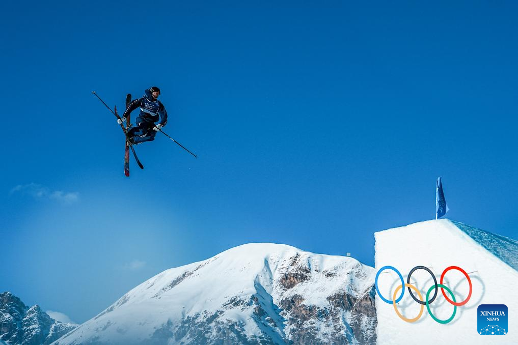 Alex Hall of the United States competes during the freestyle skiing men's freeski slopestyle qualification of the Milan-Cortina 2026 Olympic Winter Games in Livigno, Italy, Feb. 7, 2026. (Xinhua/Hu Chao)
