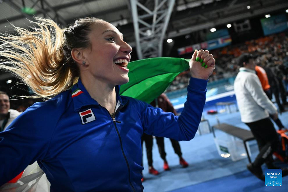 Francesca Lollobrigida of Italy celebrates after winning the speed skating women's 3000m final at the Milan-Cortina 2026 Olympic Winter Games in Milan, Italy, Feb. 7, 2026. (Xinhua/Wu Wei)