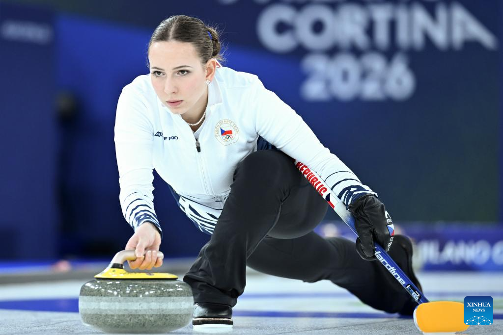 Julie Zelingrova of the Czech Republic competes during the curling mixed doubles round robin session 8 match between South Korea and the Czech Republic of the 2026 Milan-Cortina Winter Olympics in Cortina D'Ampezzo, Italy, Feb. 7, 2026. (Xinhua/Lian Yi)