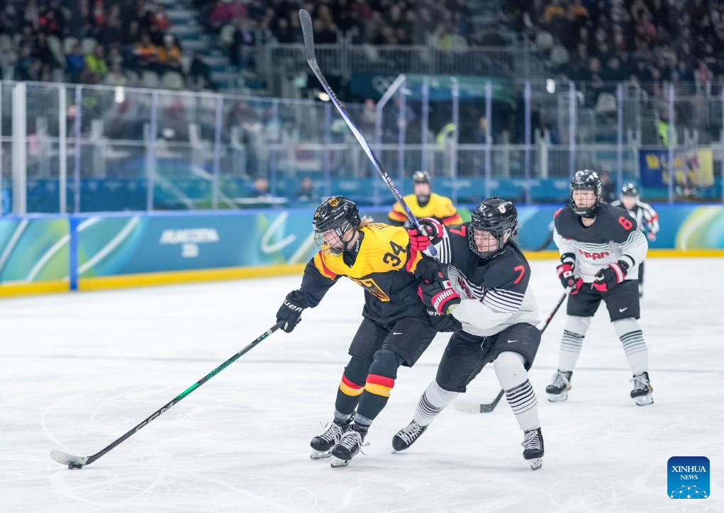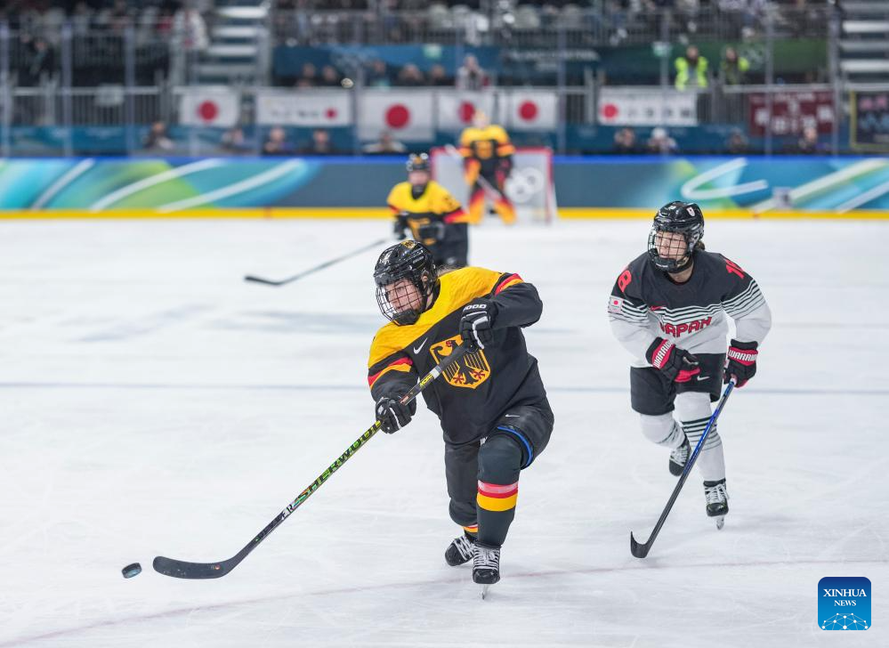 Celina Haider (L) of Germany breaks through during the ice hockey women's preliminary round group B match between Germany and Japan of the Milan-Cortina 2026 Olympic Winter Games in Milan, Italy, Feb. 7, 2026. (Xinhua/Sun Fei)