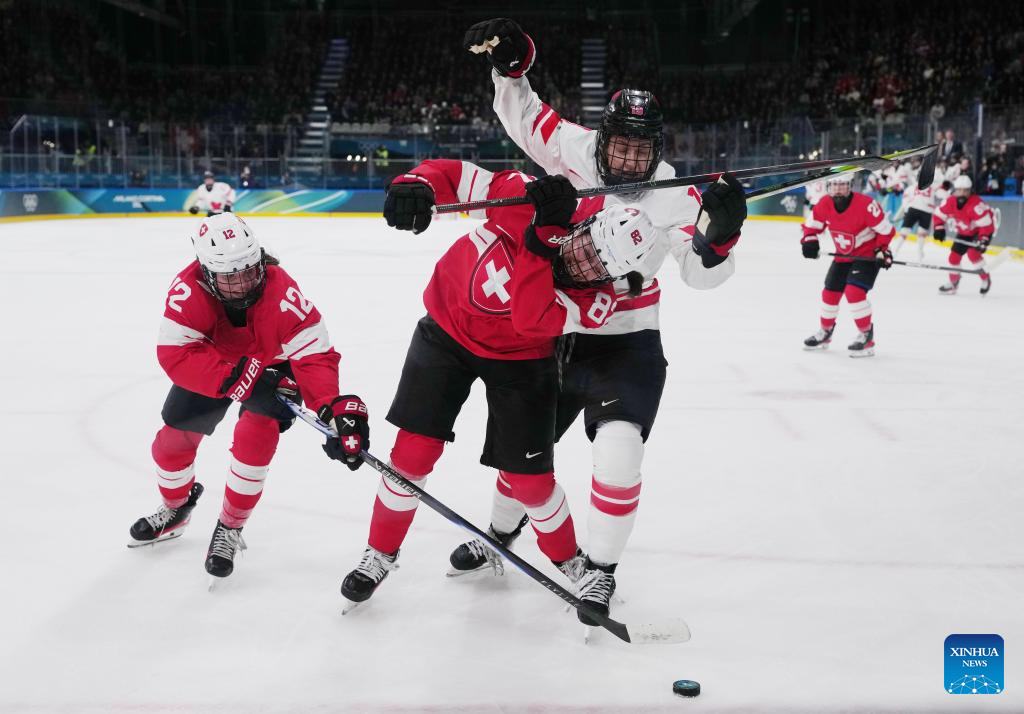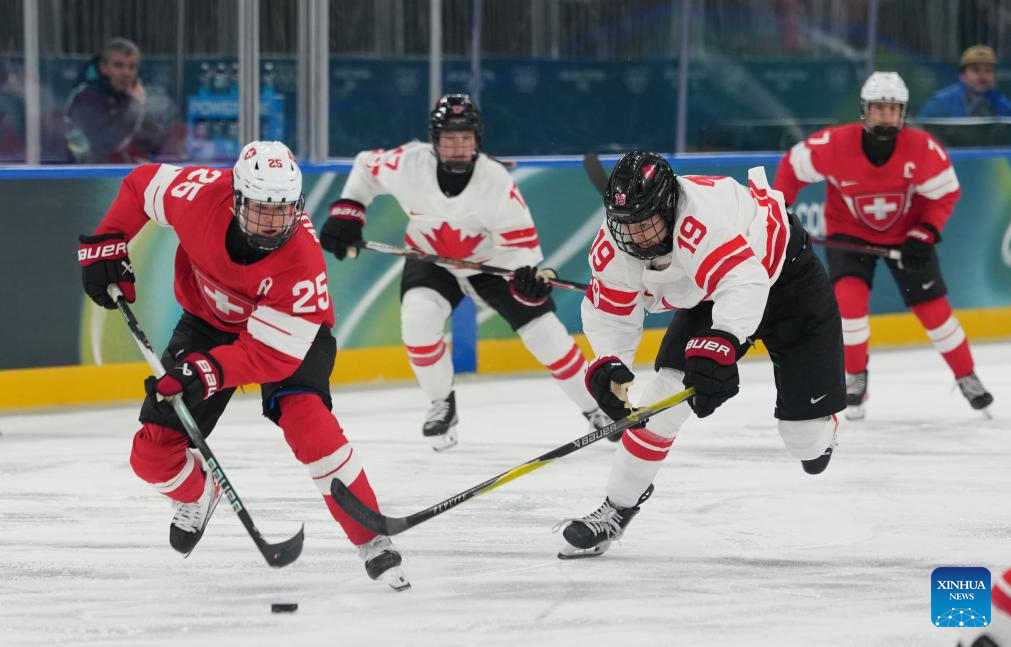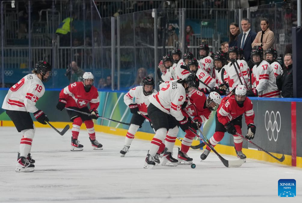 (260208) -- MILAN, Feb. 8, 2026 (Xinhua) -- Sophie Jaques (4th L) of Canada vies with Leoni Balzer (5th L) of Switzerland during the ice hockey women's preliminary round group A match between Switzerland and Canada at the Milan-Cortina 2026 Olympic Winter Games in Milan, Italy, Feb. 7, 2026. (Xinhua/Tao Xiyi)