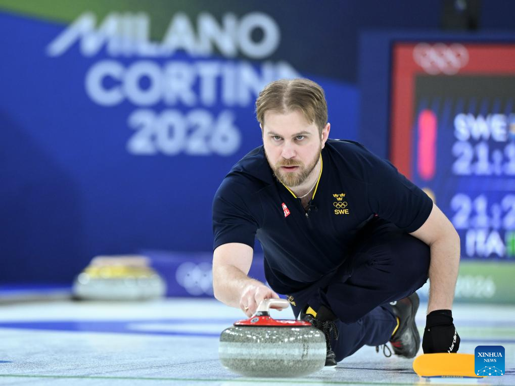 Rasmus Wranaa of Sweden competes during the curling mixed doubles round robin session 8 match between Sweden and Italy of the 2026 Milan-Cortina Winter Olympics in Cortina D'Ampezzo, Italy, Feb. 7, 2026. (Xinhua/Lian Yi)