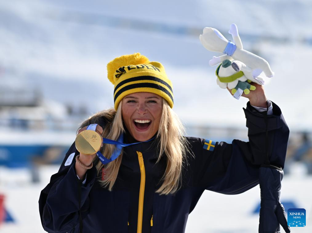 Gold medalist Frida Karlsson of Sweden celebrates during the awarding ceremony of the Cross-Country Skiing Women's 10km+10km Skiathlon of the Milan-Cortina 2026 Olympic Winter Games in Tesero, Italy, Feb. 7, 2026. (Xinhua/He Canling)