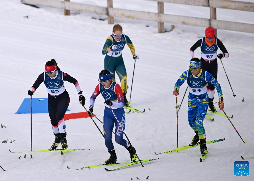 Wang Yundi (1st L) and He Kaile (1st R, back) of China compete during the Cross-Country Skiing Women's 10km+10km Skiathlon of the Milan-Cortina 2026 Olympic Winter Games in Tesero, Italy, Feb. 7, 2026. (Xinhua/He Canling)