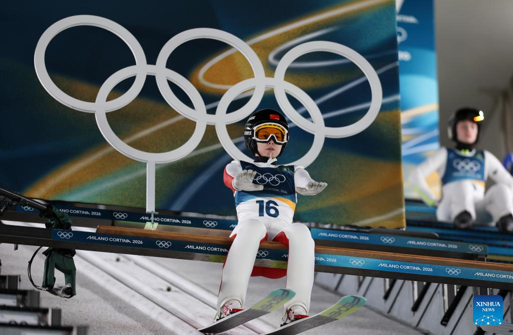 Liu Qi of China competes during the trial round of the ski jumping women's normal hill individual at the Milan-Cortina 2026 Olympic Winter Games in Predazzo, Italy, Feb. 7, 2026. (Xinhua/Meng Yongmin)