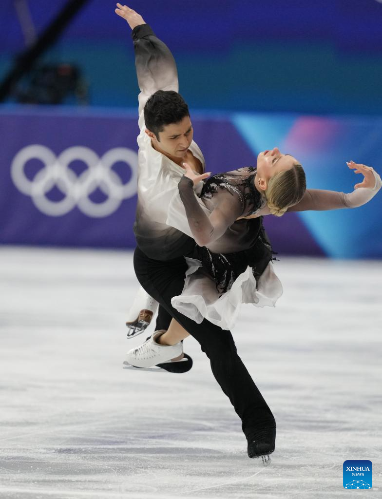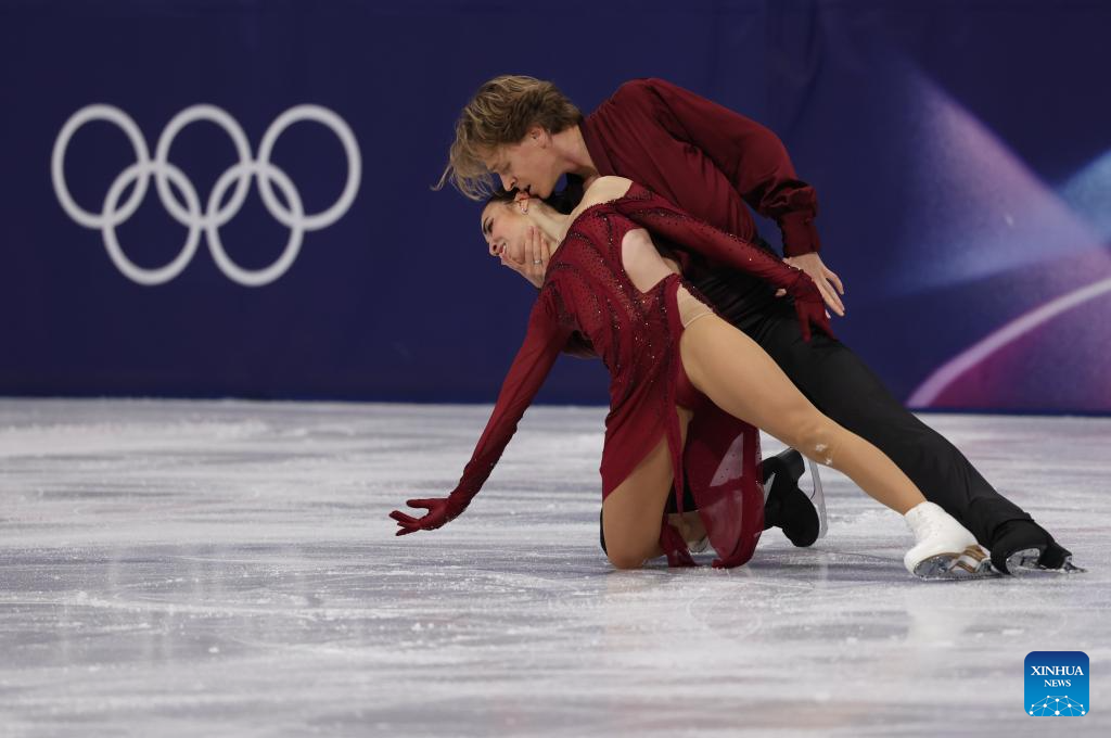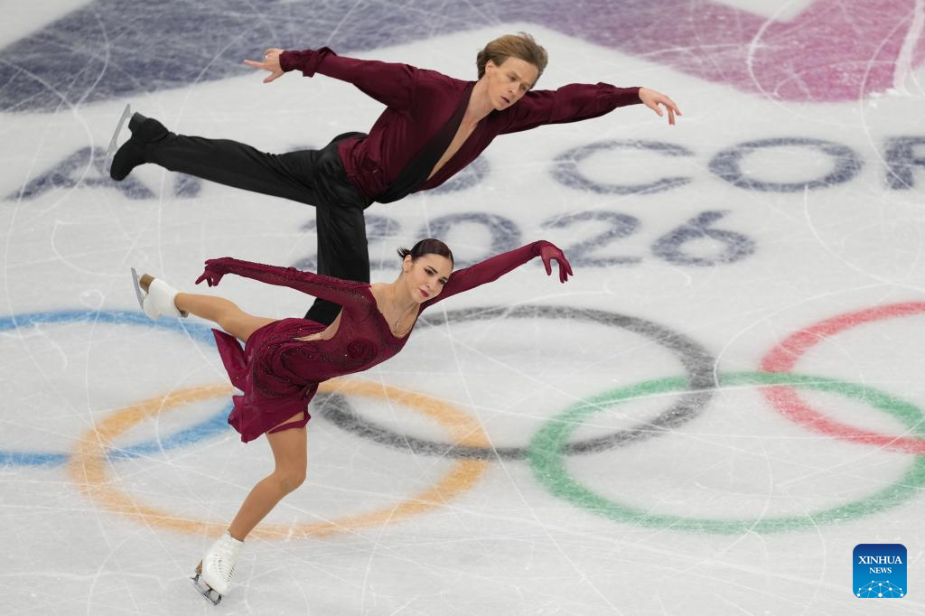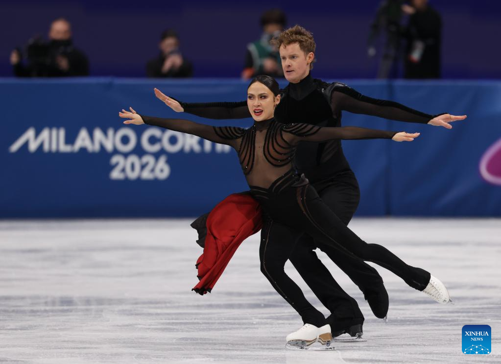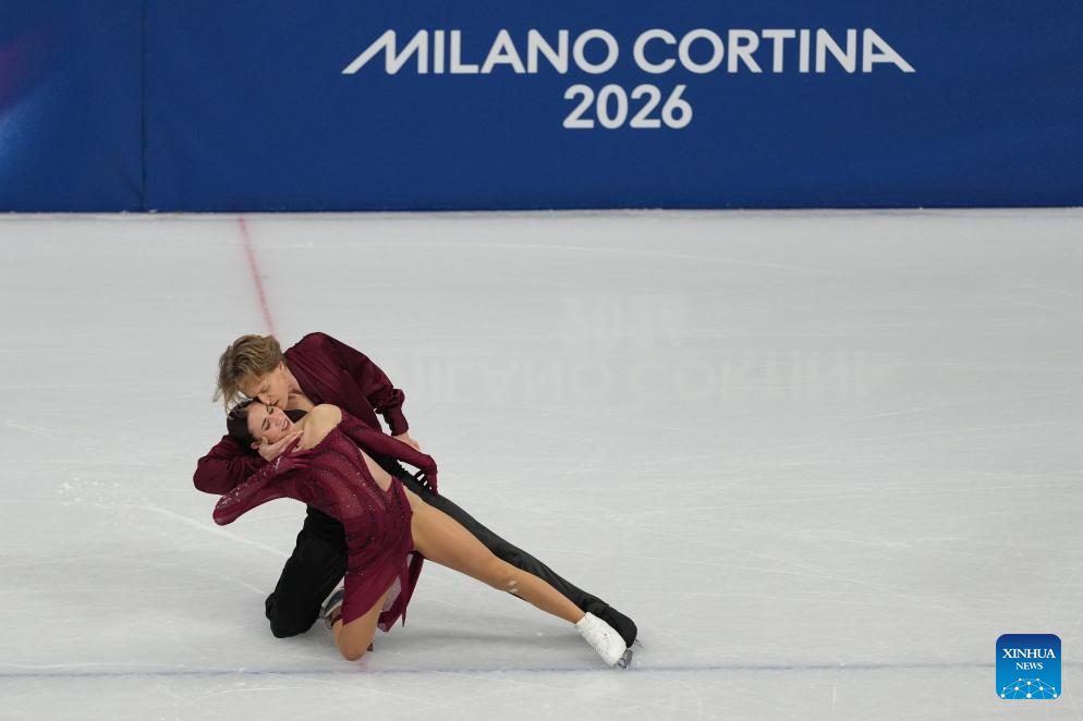(260208) -- MILAN, Feb. 8, 2026 (Xinhua) -- Madison Chock (front)/Evan Bates of the United States perform during the free dance of ice dance skating for figure skating team event at the Milan-Cortina 2026 Olympic Winter Games in Milan, Italy, Feb. 7, 2026. (Xinhua/Chen Yichen)