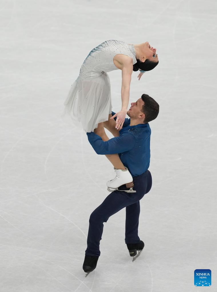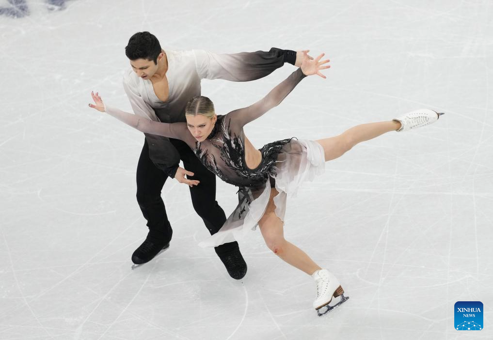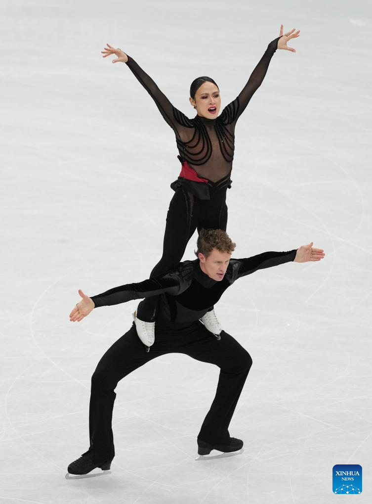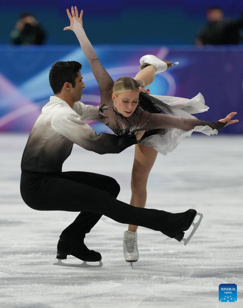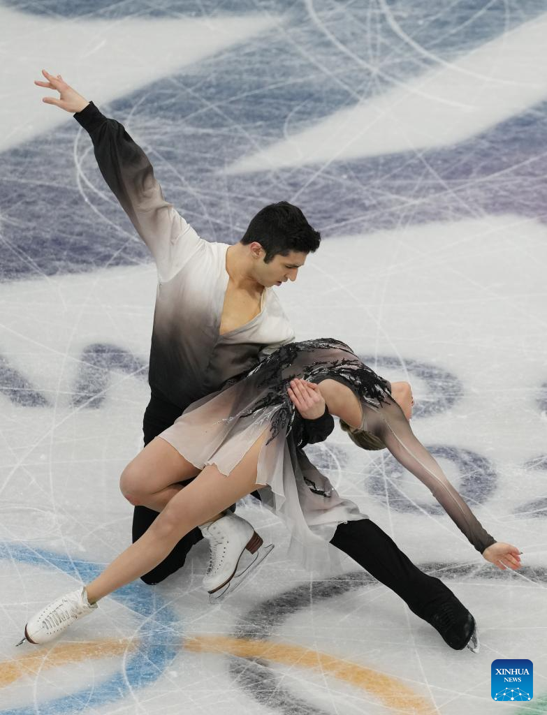 (260208) -- MILAN, Feb. 8, 2026 (Xinhua) -- Madison Chock (front)/Evan Bates of the United States perform during the free dance of ice dance skating for figure skating team event at the Milan-Cortina 2026 Olympic Winter Games in Milan, Italy, Feb. 7, 2026. (Xinhua/Chen Yichen)