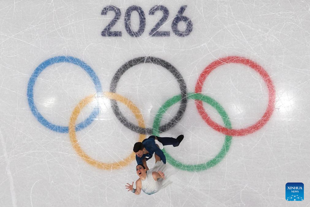 (260208) -- MILAN, Feb. 8, 2026 (Xinhua) -- Marjorie Lajoie (front)/Zachary Lagha of Canada perform during the free dance of ice dance skating for figure skating team event at the Milan-Cortina 2026 Olympic Winter Games in Milan, Italy, Feb. 7, 2026. (Xinhua/Xue Yuge)